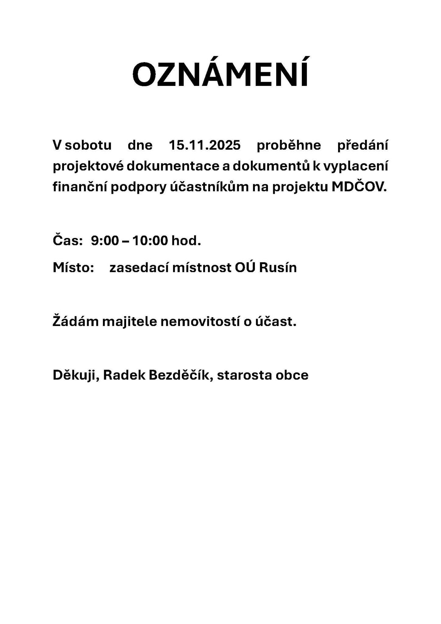 Obec Rusín / Obecní úřad / Úřední deska / Oznámení o předání projektové dokumentace a dokumentů k vyplacení finanční podpory účastníkům na projektu MDČOV